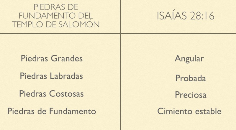 Tendríamos mucho provecho al comparar las características mencionadas en Isaías 28:16, sobre el Señor Jesucristo, y las piedras que Salomón usó como fundamento para el templo.